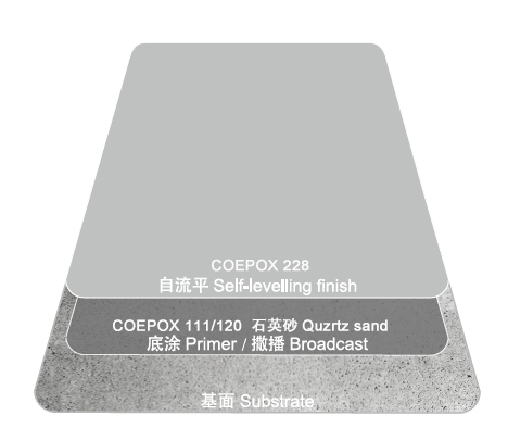 COEPOX 228 (1.5~3mm)是双组份无溶剂型酚醛环氧系统,是对地面有防腐蚀要求的项目的理想选择,耐化学品性/物理性能佳,表面平整美观,施工快捷,创造出无接缝的,防水的,平整光滑的,彩色的,密实的,抗油污的,耐化学品的,耐磨损耐冲击的地面,可以每天冲洗。