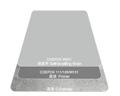 COEPOX W231 (1.5~3mm) 是双组分水性环氧自流平系统,是工业/商业项目地面(包括磨损地面)的理想选择,耐化学品性/物理性能佳,表面平整美观。施工快捷,创造出无接缝的,防水的,平整光滑的,彩色的,密实的,抗油污的,耐化学品的,耐磨损耐冲击的地面,可以每天冲洗。